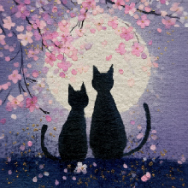 【月と桜に見守られる、ふたりの猫の花明かり】深い藍色の夜空に満ちた月と花明かりのように咲く桜の下で、二匹の黒猫が並んで夜空を見上げる、水彩タッチのライブ壁紙