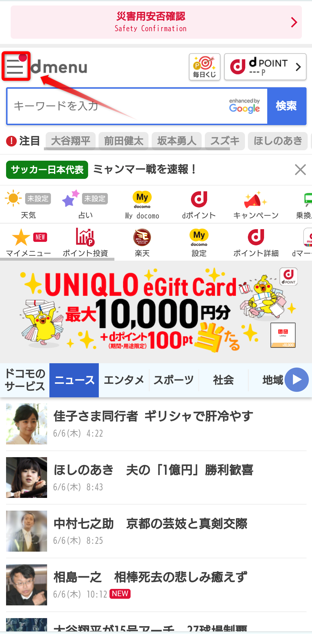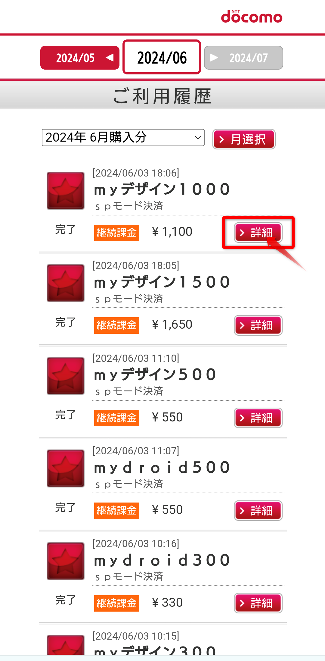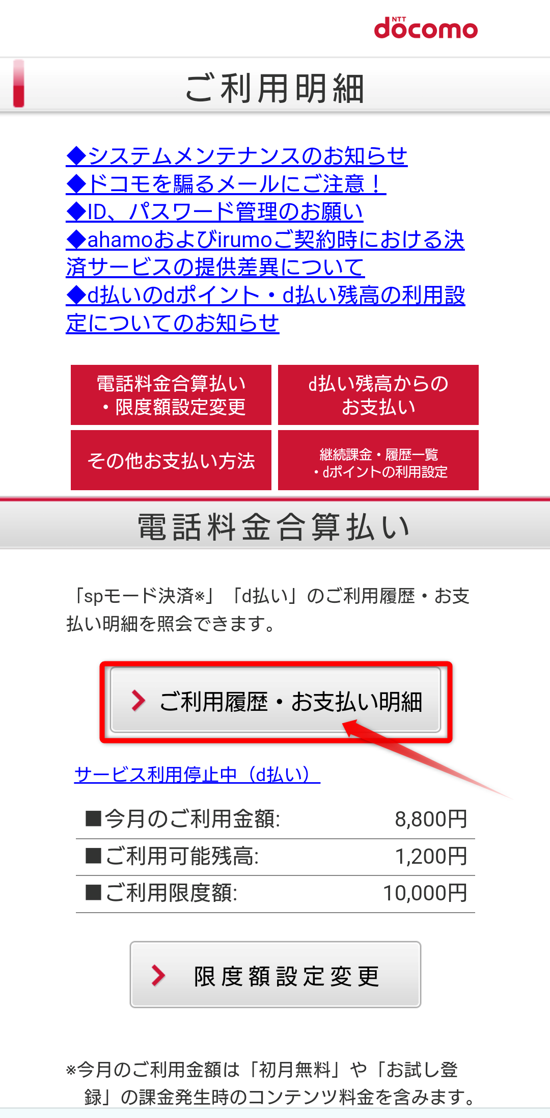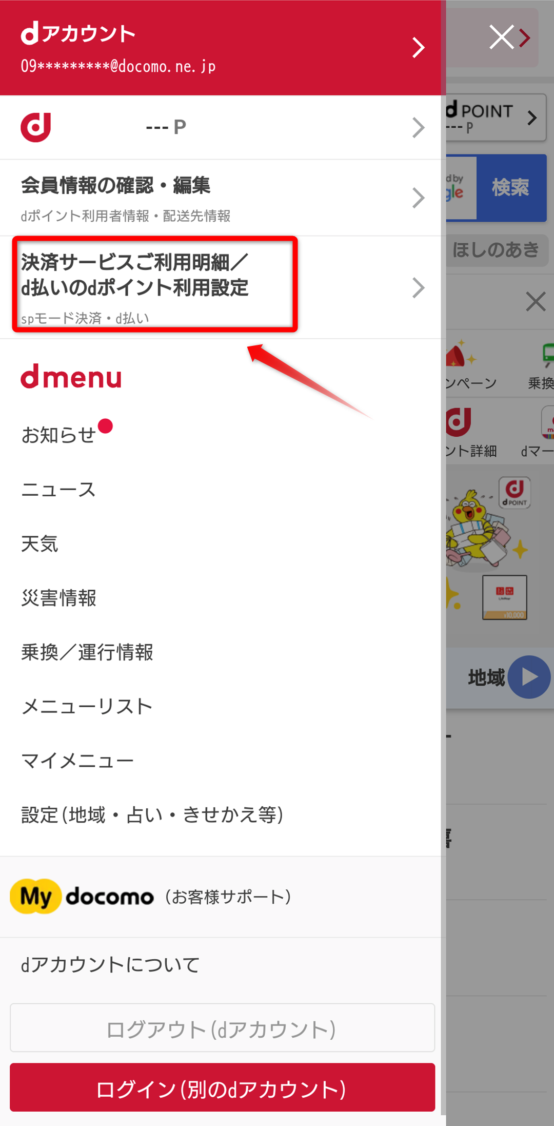 2.サイドメニュー「決済サービスご利用明細/d払いのdポイント利用設定」ボタンをタップ